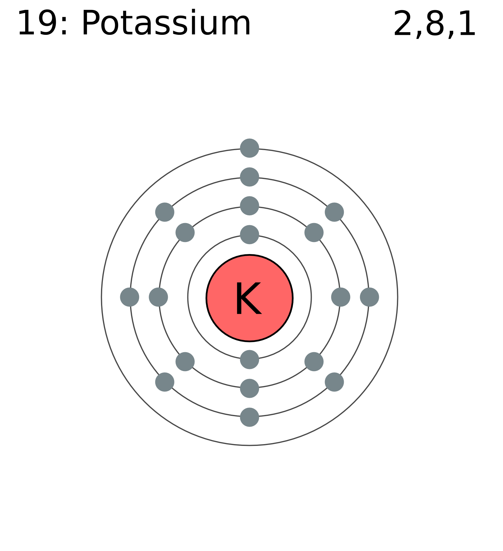 Potassium is an element with four shells of electrons (2,8,8,1) that orbit the nucleus which most often contains 19 protons and 20 neutrons... Potassium is an element with four shells of electrons (2,8,8,1) that orbit the nucleus which most often contains 19 protons and 20 neutrons. The atom consist of a small but massive nucleus surrounded by a cloud of rapidly moving electrons. The outermost shell in the bohr diagram of potassium contains only 1 electron that also called valence electron. The nucleus is composed of protons and neutrons. Potassium is an essential constituent for plant growth and is found in most soils.. The chemical symbol for potassium is k.